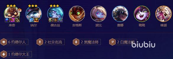 2、陣容羈絆:6約德爾人2社交名流2黑魔法師2白魔法師1約德爾大王