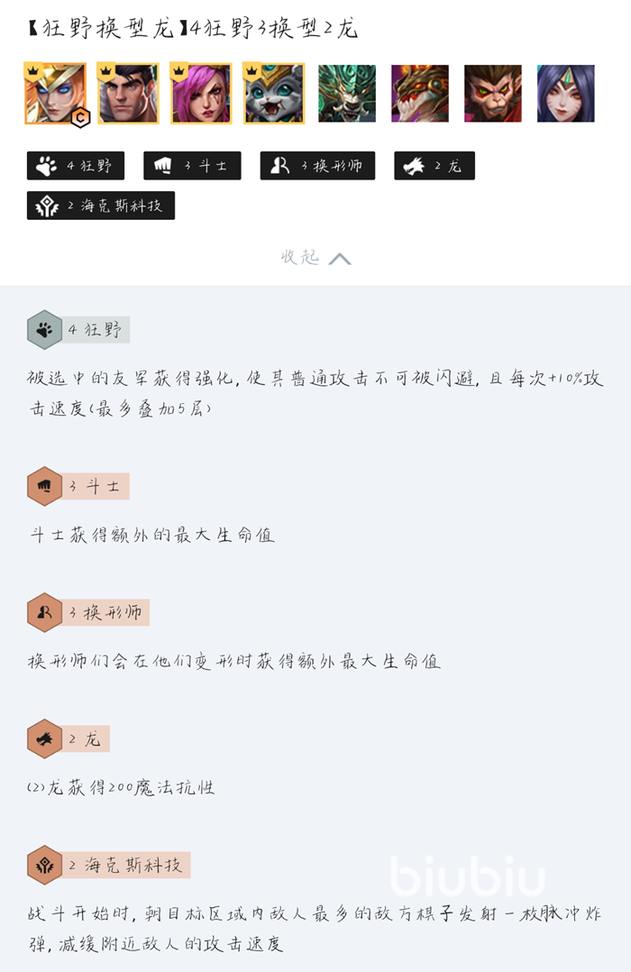 四狂野效果給到龍女可以使龍女的普攻不可閃避,三換形師可以使龍女釋放技能后獲得生命值,三斗士增加陣容坦度,兩龍?jiān)黾幽Х剐浴?/p>