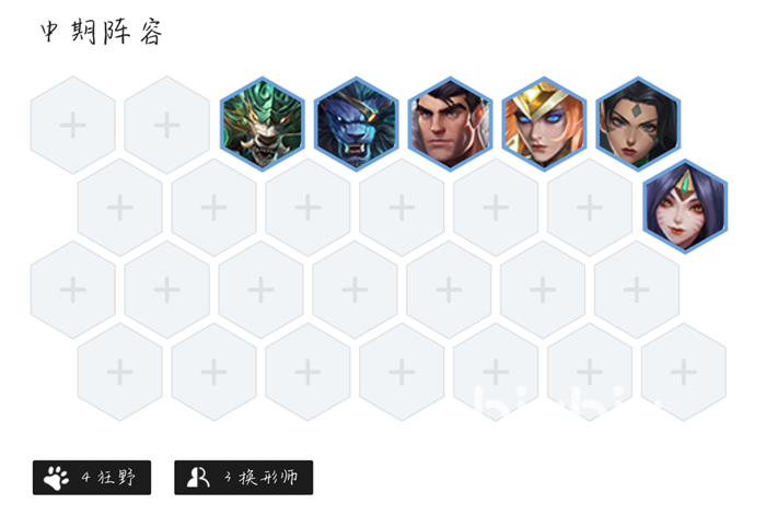 前期用三換形師和兩狂野過(guò)渡,正常升級(jí),等到龍女,開(kāi)四狂野,給龍女吃到buff,如果龍女裝備好的話,二星龍女即可鎖血。