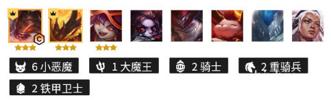 陣容羈絆:六小惡魔一大魔王兩騎士?jī)芍仳T兵兩鐵甲衛(wèi)士。