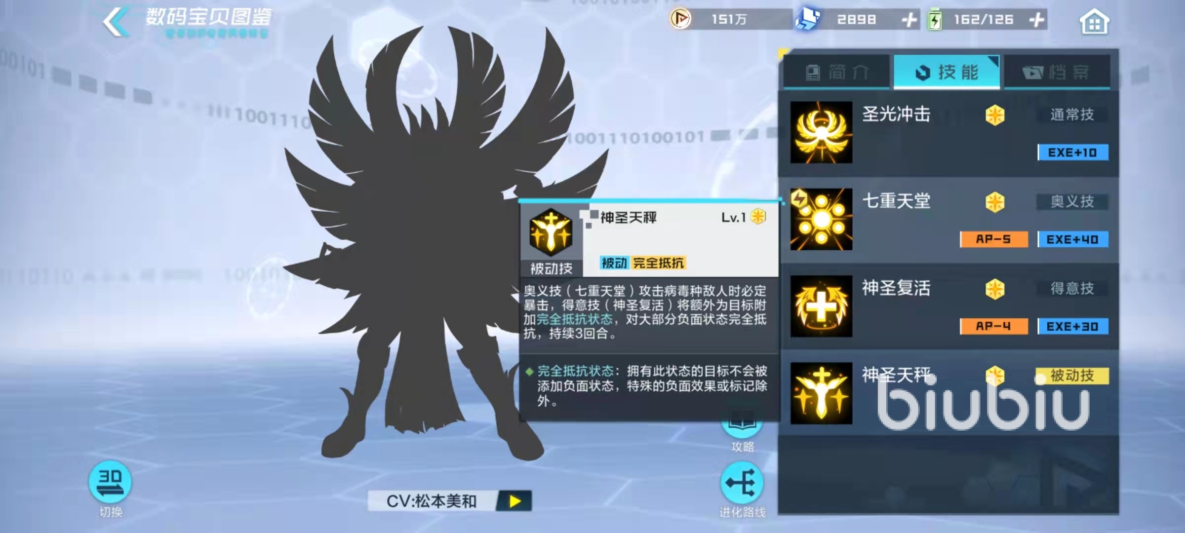 其中經(jīng)番長獅子獸的技能的得意技能打架高手,可以在受到致命傷害的時候,立即接觸自身所有的異常狀態(tài),當然也就包括中毒了。熾天使獸是光屬性的輔助數(shù)碼寶貝,除了可以加血之外,還可以凈化。被動技能神圣天平,可以在使用技能神圣復活的時候,為己方的一個目標附加完全抵抗狀態(tài),可以抵擋一次不良的效果也包括中毒,這一層狀態(tài)可以持續(xù)三個回合。