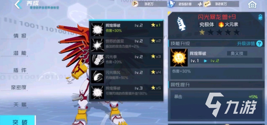 說到火屬性寶貝,第一個要提的便是鳳凰獸,鳳凰獸是目前游戲中火屬性最為強力的數(shù)碼獸之一,其必殺技在使用之后可以給隊伍中攻擊力最高的隊友提供30%的傷害加成,如果是火屬性的數(shù)碼獸,那么這個加成效果可以直接提高50%。