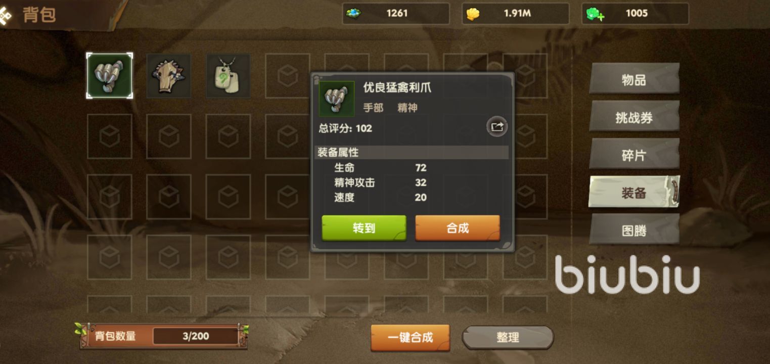 裝備合成:在游戲中的裝備是可以快速提升我們戰(zhàn)斗力的,而裝備的獲取條件有些苛刻,再打某一個章節(jié)關卡,最后一關勝利才會給一到兩件裝備,或者是每天離線掛機收益的獎勵中,也會隨機給到一件白裝,另外獲取裝備的方法就是充錢了,這些低等的裝備都是可以通過三件來轉化成一件高級的裝備,也是需要大家在背包里點擊合成,不過對于平民玩家來講,不太建議追求最高級別的裝備,有這條件,還不如把自己上陣的六個寵物全部穿滿史詩或者是精英級別的裝備,戰(zhàn)斗力足夠應付大部分戰(zhàn)斗了。