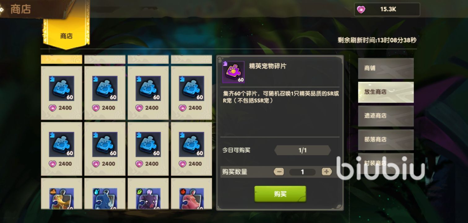寵物合成:在游戲中的寵物分為ssr,sr,和r等級,這些等級的寵物有的可以直接通過精準碎片在背包里直接兌換,而有的獲取的碎片只是普通寵物碎片和精英寵物碎片,普通寵物碎片集齊60個之后可以隨機合成一個r級別的寵物,精英寵物碎片可以合成sr寵物,當然臉黑的話,也只能合成r級別的寵物。這些碎片可以在放生商店中使用放生碎片進行兌換,在遺跡商店中使用遺跡碎片進行兌換,在部落商店中使用部落碎片進行兌換。