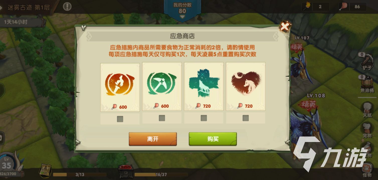 在迷霧古跡探險(xiǎn)的時(shí)候,還要注意應(yīng)急商店中的四個(gè)商品,如果實(shí)在是碰到藤蔓無法通過,并且沒有火把的時(shí)候,?就可以使用600個(gè)食物購買,比原價(jià)貴了一倍,但是僅限于應(yīng)急情況,有耐心的小伙伴可以等到第二天花300食物購買。如果碰到實(shí)在打不過去的怪物,就可以在左下角的事件中購買經(jīng)驗(yàn),也是需要花費(fèi)食物來提高等級(jí),這樣等到第二天再次獲得食物之后,就能通過了。