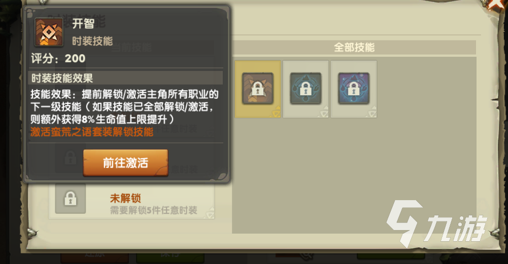 先來看一看“開智”這個技能,該技能的效果是有兩種的,第一種就是提前解鎖或者說激活主角下一個階段的技能。大家都知道主角的技能是比較多的,而一些強力的技能都是要在中后期解鎖的,這個效果可以幫助玩家更早的體驗到高級技能,對于戰(zhàn)斗和實力的提升幫助也是很大的。第二種效果就是在技能完全解鎖的情況下觸發(fā)的,這個情況下主角會獲得額外8%的生命值提升,對于生存來說幫助很大。