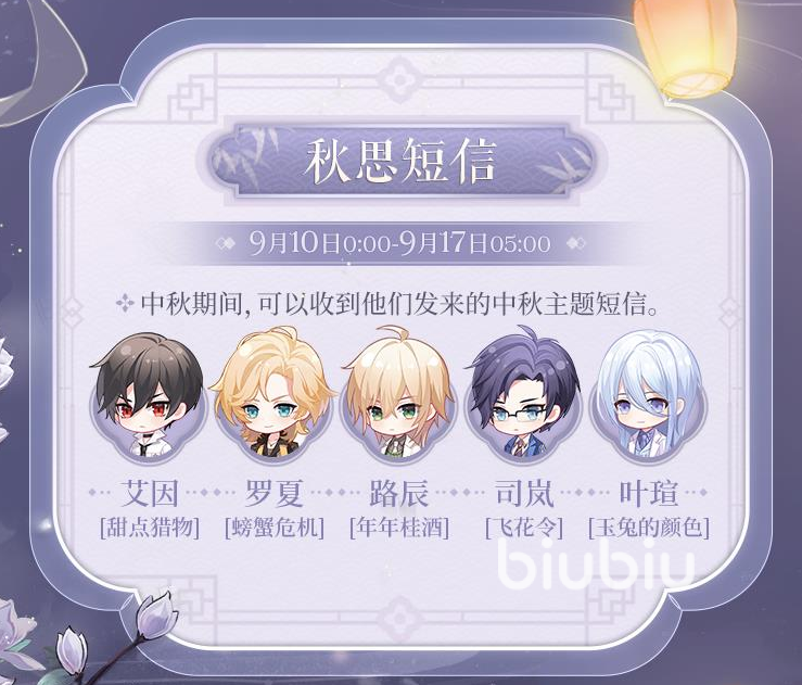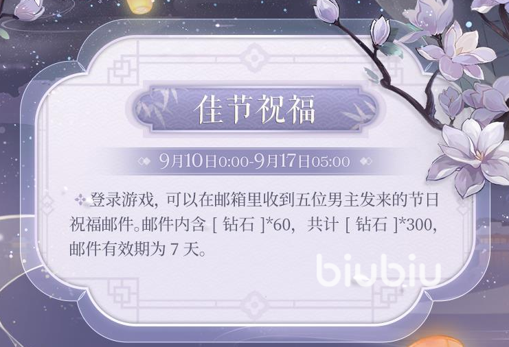其中佳節(jié)祝福的時間是在九月十號開始,持續(xù)到十七號結束,期間大家能夠獲得來自五位不同男神的祝福,共計獎勵300鉆石。