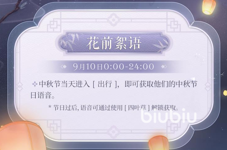更有花前絮語來襲,讓大家能夠更好的體驗到游戲,在中秋節(jié)當天進入出行,就能夠有機會得到為大家定制的中秋節(jié)語音,在節(jié)日過后,就能夠通過四葉草來解鎖并使用了。