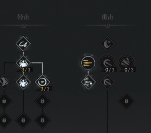 不管大家選擇的是哪一個流派,在加點時都需要先去點輕攻擊,然后去點輕攻擊的衍生攻擊去給這些攻擊點滿,在點滿以后去點重攻擊,這重攻擊加點也是一樣全部點滿,隨后點策略攻擊,這個先點左邊。