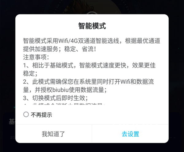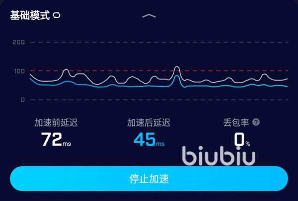這里也要向大家分享兩個小技巧,biubiu目前提供了兩種不同的模式。第一種叫做基礎模式,顧名思義就是默認使用的優(yōu)化服務,通過鎖定WiFi或者是移動數(shù)據(jù)進行單網(wǎng)絡的加速優(yōu)化,為我們自動甄別并且選擇合適的線路以及節(jié)點。第二種就是智能模式,適合在WiFi或者是移動數(shù)據(jù)信號不穩(wěn)定的時候使用,能夠自動在這兩種網(wǎng)絡環(huán)境下進行無縫切換,確保玩家擁有穩(wěn)定的體驗。