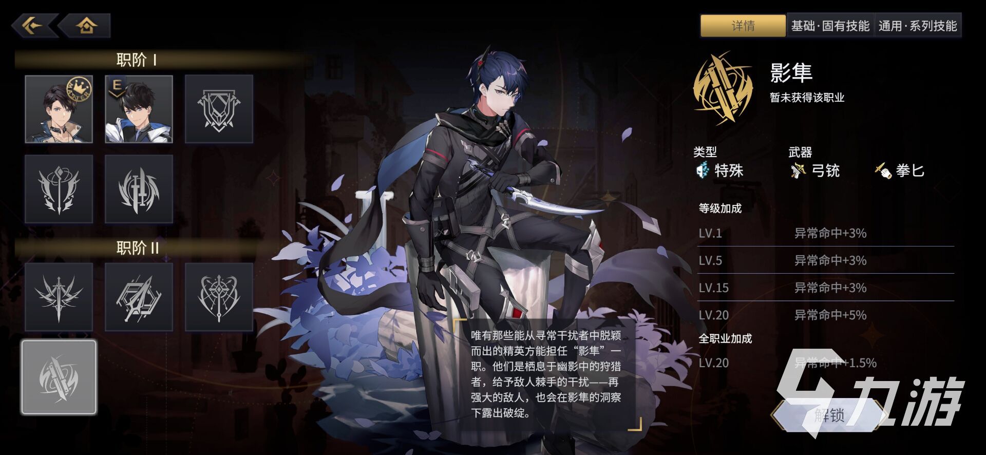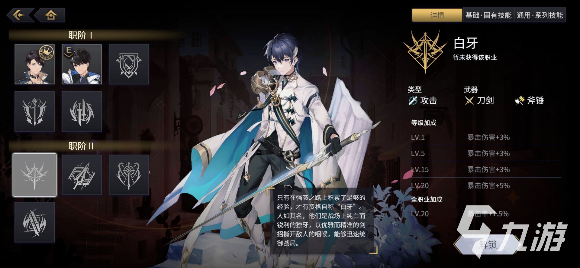 職業(yè)階級(jí)影響:玩家們選擇哪個(gè)職業(yè)會(huì)影響各位玩家在游戲中裝備的武器類型,當(dāng)職業(yè)等級(jí)達(dá)到一定階段的時(shí)候,比如說20級(jí)就可以解鎖全職業(yè)共通的永久屬性增益加成,并解鎖對(duì)應(yīng)的高階職業(yè),也就是二階轉(zhuǎn)職,白牙,蝕騎士,牧者和影贛。