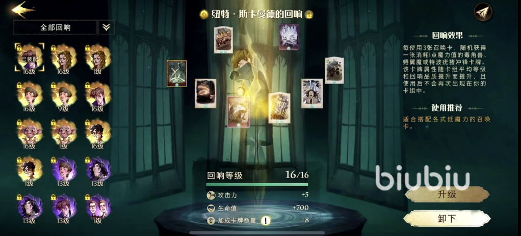 因為紐特的回響可以在每次使用定量召喚卡之后,手里都會被加入一張單獨可以消耗一點魔力的生物卡,比如特波疣豬,獨角獸等,那就需要玩家盡可能多多觸發(fā)這個增益效果,最好是在多在場內召喚神奇生物,數(shù)量越多對敵人的壓制越強。當角色積攢滿足條件之后就可以連續(xù)的丟出兩張手牌,而這樣的舉動對敵人會造成很大的威脅呢。