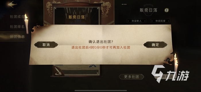 進(jìn)入社團(tuán)之后我們點(diǎn)擊茶幾上的社團(tuán)資料,在這里我們可以看到當(dāng)前社團(tuán)的成員、貢獻(xiàn)度、社團(tuán)排名以及社團(tuán)的信息。我們點(diǎn)擊左側(cè)的社團(tuán)信息,在這里我們可以看到社團(tuán)的名稱、社團(tuán)的標(biāo)簽、社團(tuán)的宣言等信息,然后在下方有一個(gè)更多社團(tuán)以及離開社團(tuán)。點(diǎn)擊離開社團(tuán)之后會跳出一個(gè)對話框需要我們進(jìn)行確認(rèn)。一旦退出社團(tuán)之后我們必須要在4個(gè)小時(shí)之后才可以重新加入新的社團(tuán),這里需要大家注意一下。點(diǎn)擊確認(rèn)之后就成功退出社團(tuán)了。