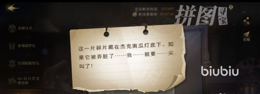 此外,玩家可能還會觸發(fā)副線拼圖提示:這一片碎片藏在杰克南瓜燈下。如果被它弄臟了.......我......就要.....尖叫了。其實這個提示就是要玩家到海格小屋門前,挑戰(zhàn)小南瓜,點擊后用預(yù)設(shè)卡組戰(zhàn)斗即可。戰(zhàn)斗比較簡單,只要把惡婆鳥放出來就行,接下來就隨便扔些咒術(shù)卡就能過。
