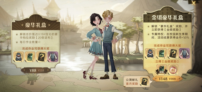 我們點擊右下方的心動解鎖,可以看到目前游戲中有豪華禮盒以及金緞豪華禮盒的區(qū)別。豪華禮盒售價是88元,通過解鎖豪華禮盒我們可以獲得總價值達到17784寶石的獎勵以及每天額外一個作業(yè)數(shù)量,另外還可以獲得神器動物嗅嗅、阿瓦達索命、一張隨機傳奇卡牌以及一個繽紛假日外觀。