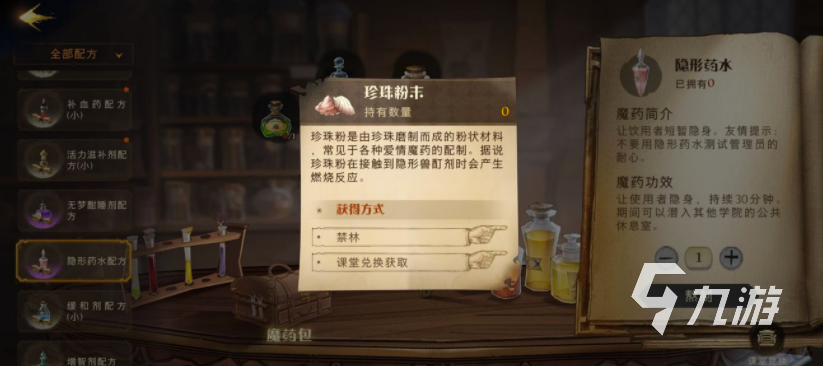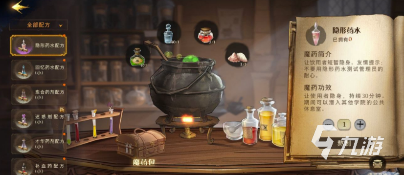 想要看到角色是否擁有隱身藥水的話,那么就的讓角色回到自己的寢室里邊,在寢室的界面會看到魔藥菜單,直接點擊就可以查看到相對配方跟煉制方法。如果玩家想要查看角色的已有藥水的話,就可以直接點擊魔藥包的摁鈕就可以了。