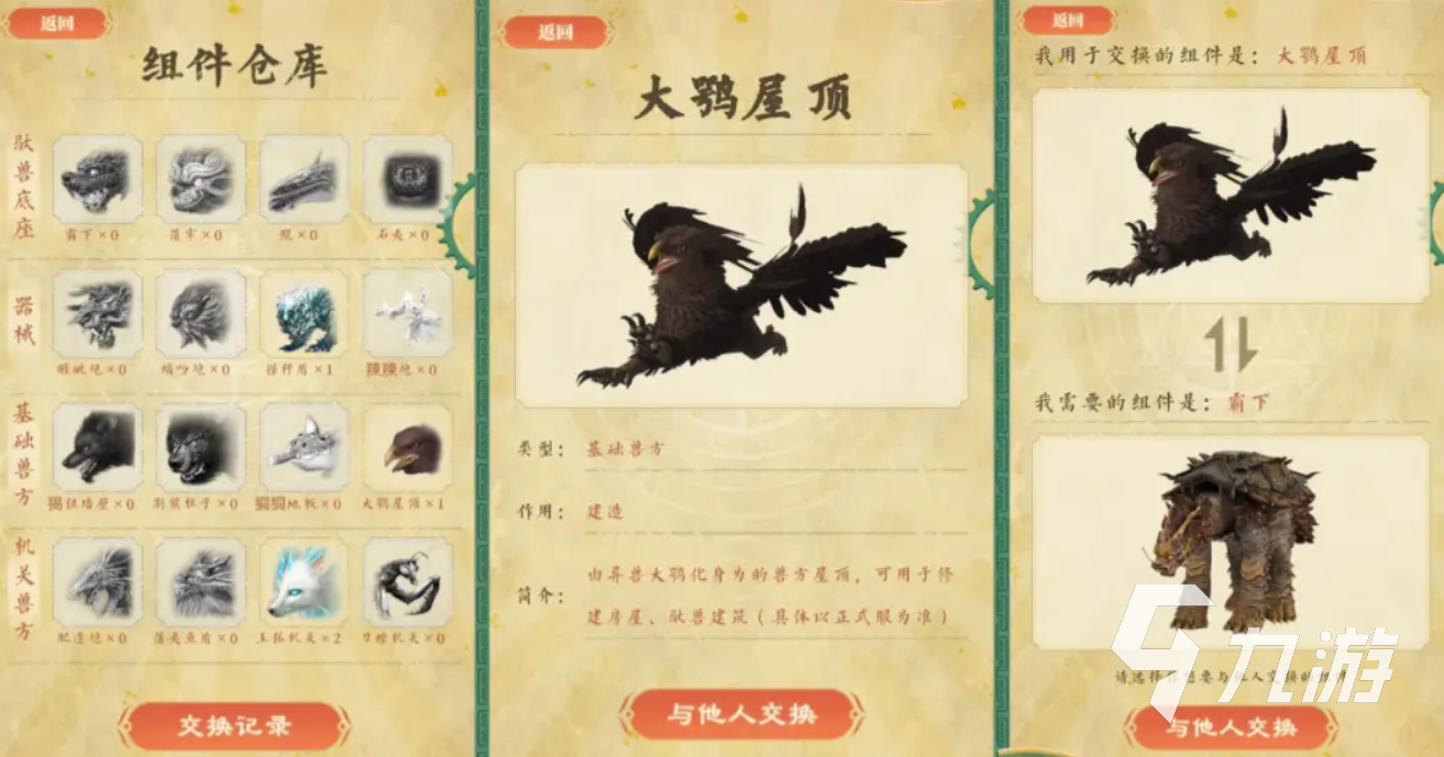 通過九游app預(yù)約,綁定角色后點(diǎn)擊預(yù)約按鈕,獲取提醒資格并鎖定獎(jiǎng)勵(lì)。領(lǐng)取組件,通過每日登錄、邀請(qǐng)好友等方式獲得不同“組件”,可在倉庫查看作用并進(jìn)行好友交換。選擇本體、器械、基礎(chǔ)獸方、機(jī)關(guān)獸方等,嘗試組裝出專屬馱獸,甚至有機(jī)會(huì)獲得SS級(jí)馱獸!