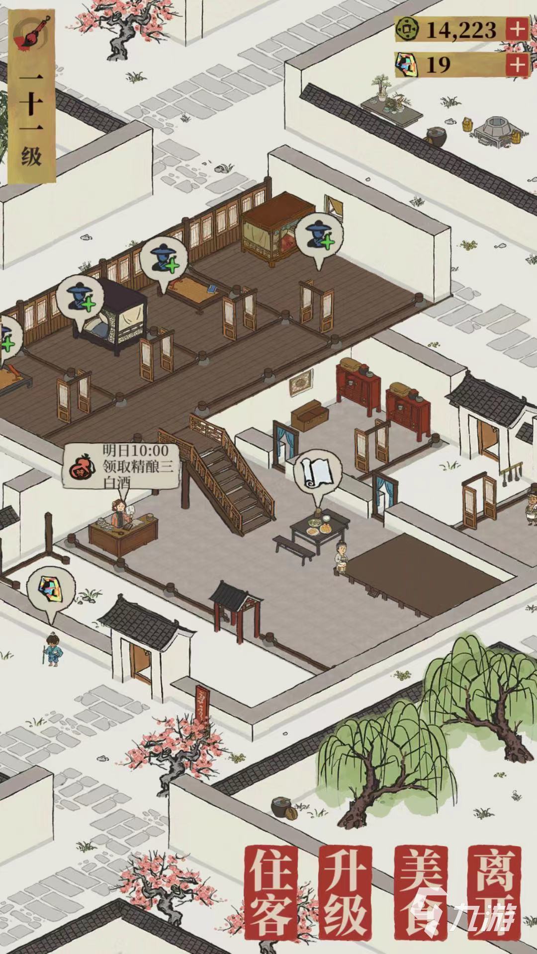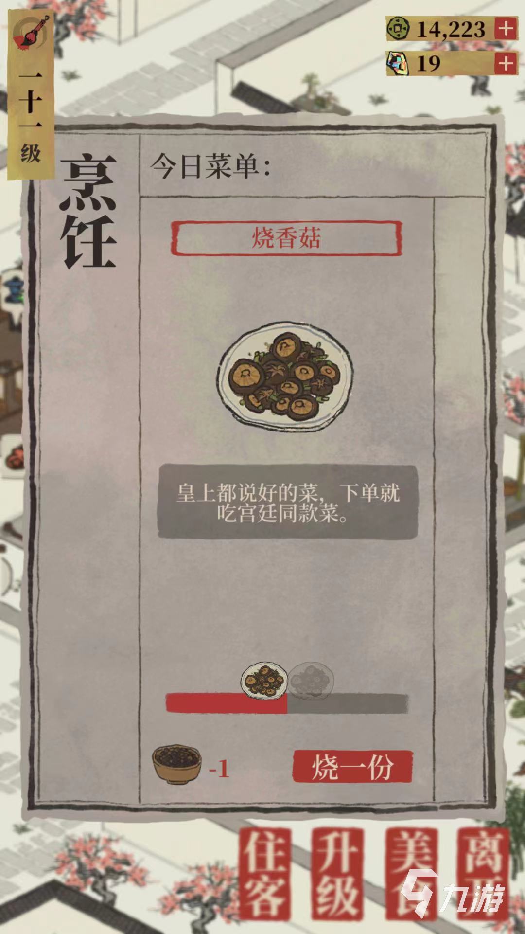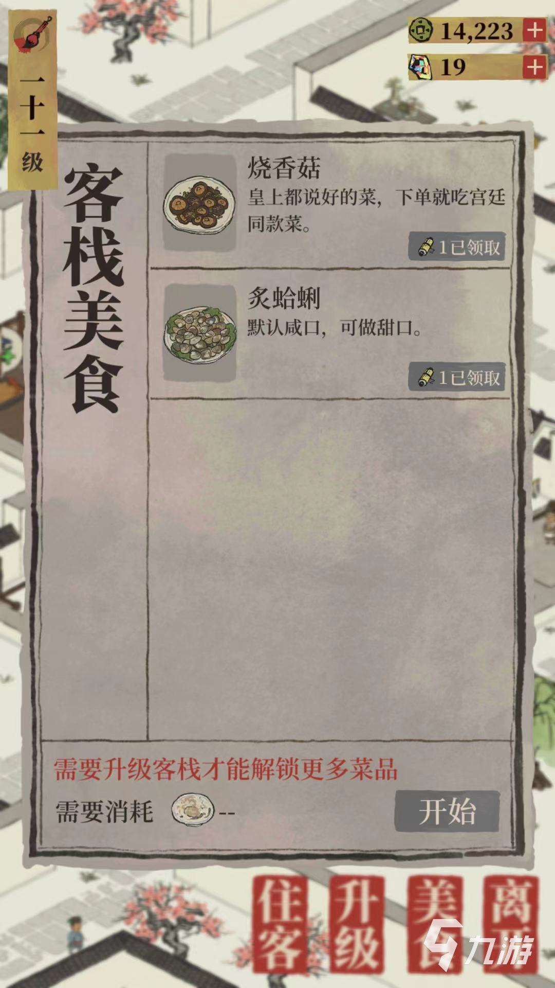 除了開(kāi)發(fā)新菜品,玩家在住客記錄中可以查詢(xún)的住客的詳細(xì)要求,當(dāng)滿(mǎn)足住客的菜品要求后,可獲得相應(yīng)的道具獎(jiǎng)勵(lì)。在升級(jí)中玩家通過(guò)滿(mǎn)足升級(jí)條件和消耗材料即可順利升級(jí),當(dāng)通過(guò)不斷升級(jí)客棧后,可以增加稅收率和客棧材料數(shù)量。