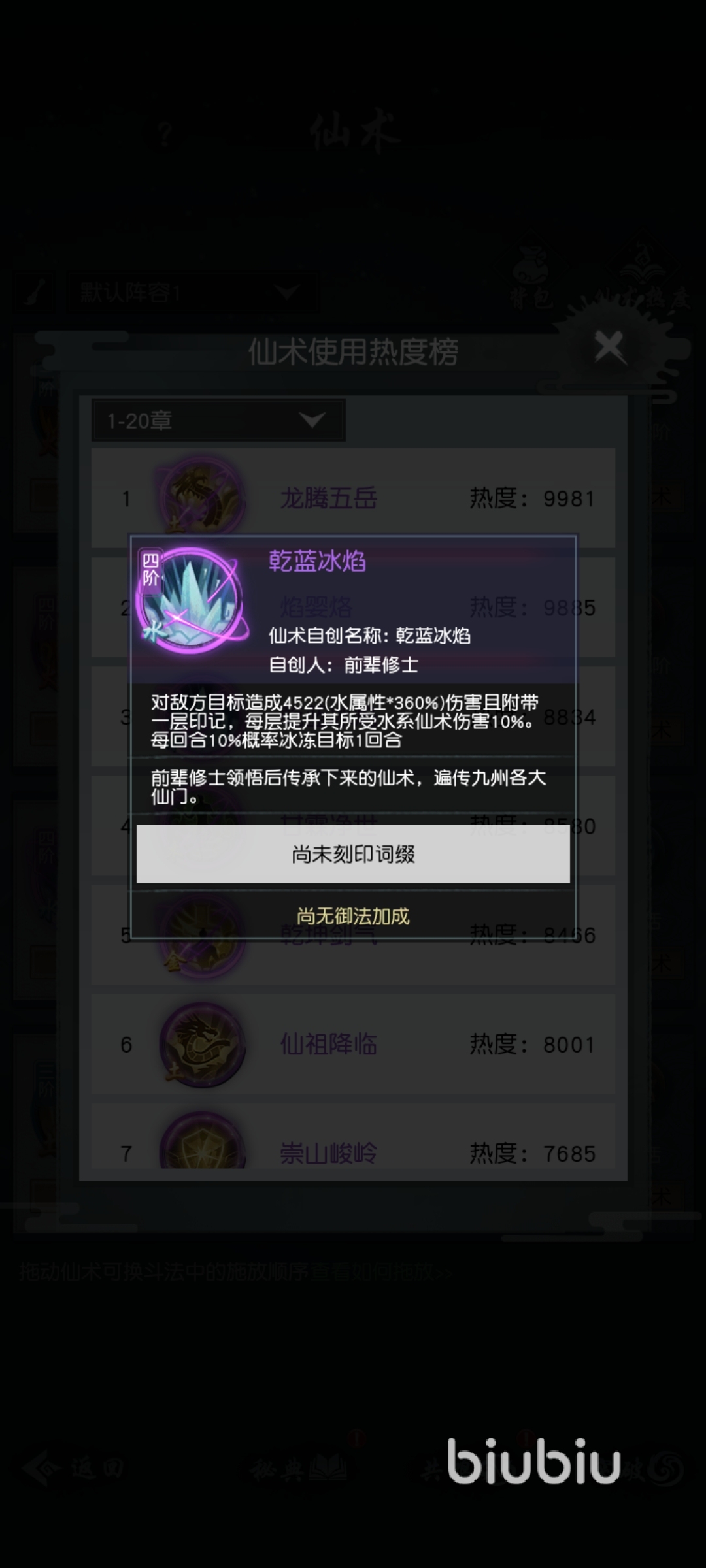 水屬性紫色法術(shù):乾藍(lán)冰焰:對(duì)敵人造成水屬性*360%的傷害,附帶印記,每一個(gè)印記可以提高敵人受到水屬性傷害的10%,并且有概率冰凍敵人。有良好的傷害和控制效果。