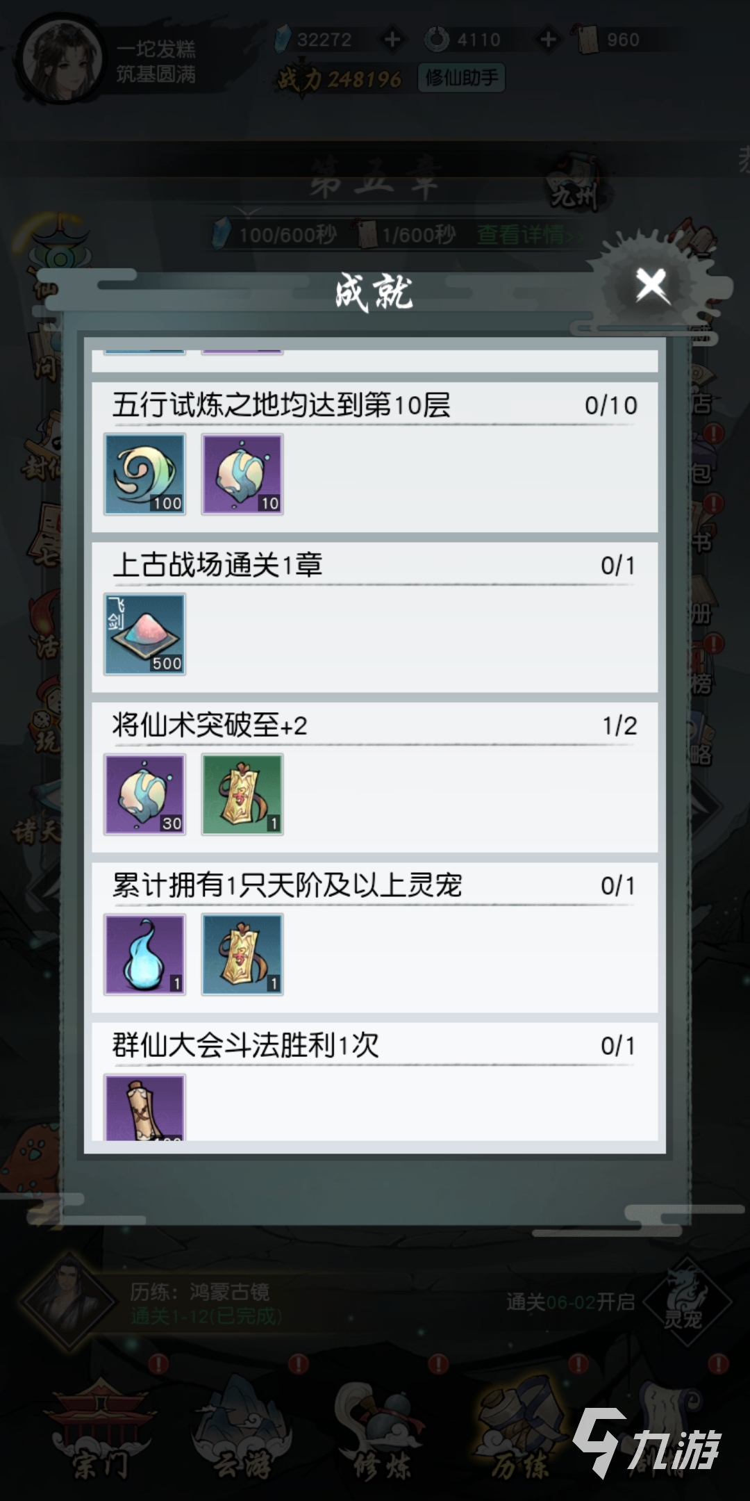 成就這里是比較好完成的,一般只要解鎖了試煉之地就能夠獲得五靈精華,玩家達(dá)到試煉的第五層和第十層的時(shí)候,分別能得到10個(gè)五靈精華,除此之外,將仙術(shù)突破到兩級(jí)同樣也能獲得三十個(gè)五靈精華。