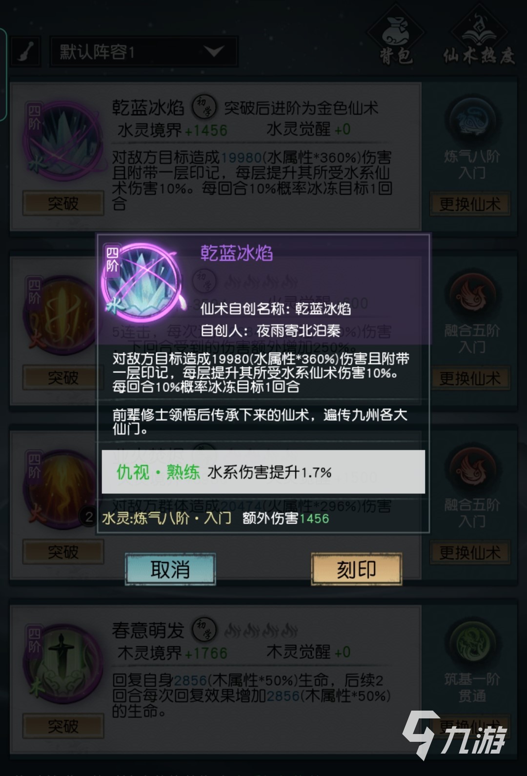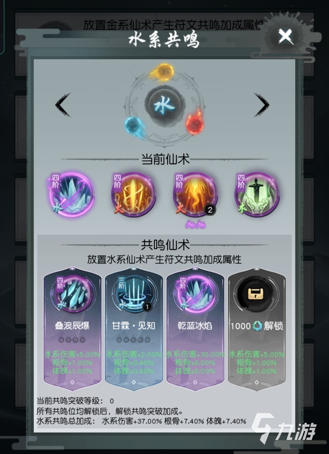 玩家們還可以在仙術(shù)界面的底部找到共鳴按鈕,點(diǎn)擊進(jìn)入共鳴界面后就可以查看仙術(shù)對(duì)于共鳴的加成了,這里我們可以看到乾藍(lán)冰焰對(duì)于水系仙術(shù)的傷害加成是很高的哦!