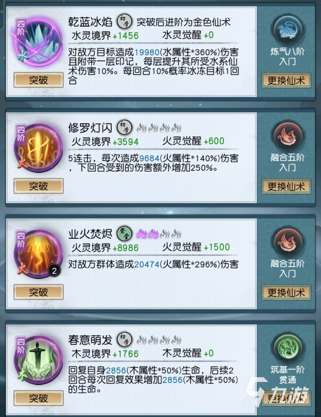 玩家點(diǎn)擊進(jìn)來(lái)之后就會(huì)看到自己目前上陣的四種仙術(shù)了,另外,玩家可以點(diǎn)擊仙術(shù)底下的突破來(lái)對(duì)仙術(shù)進(jìn)行突破,進(jìn)一步提高玩家仙術(shù)的威力哦,還有就是右邊的更換仙術(shù),玩家獲得更厲害的仙術(shù)可以點(diǎn)擊更換仙術(shù)來(lái)更換新的仙術(shù)了!