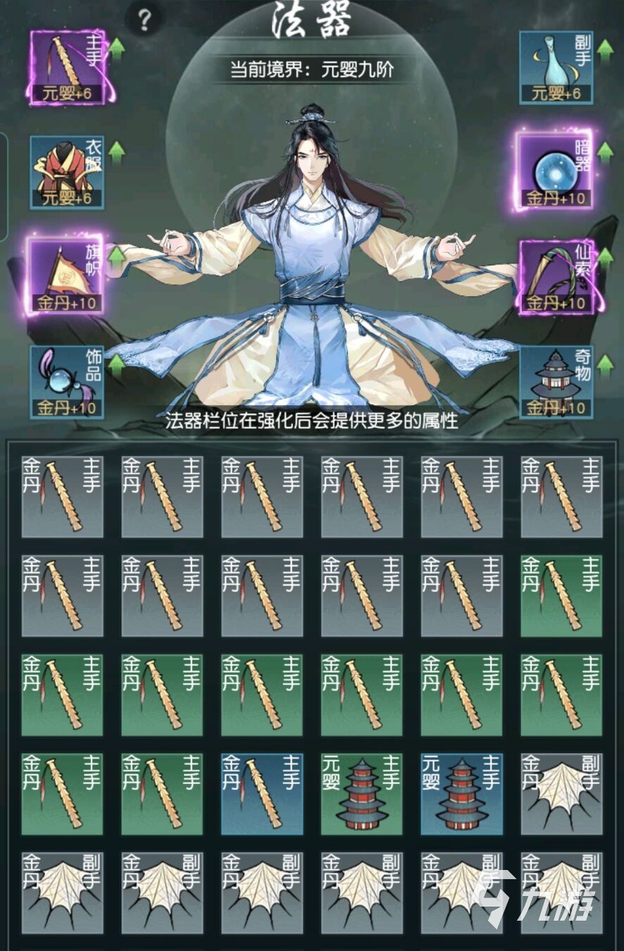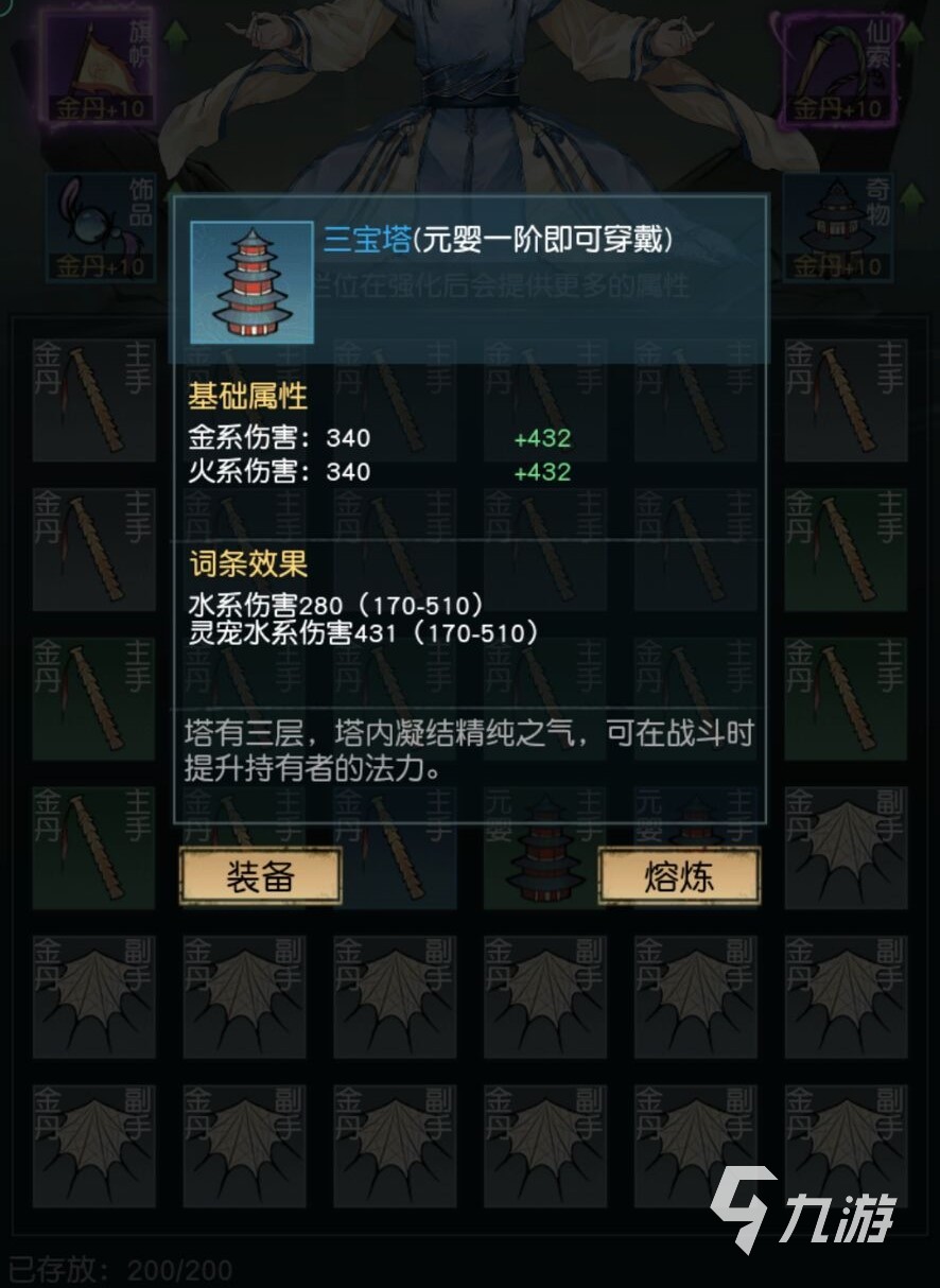 玩家點擊法器按鈕進入法器的主界面后,可以在法器背包看到自己所有的法器,包括自己已經(jīng)裝備的和沒有裝備的法器,玩家可以在裝備界面切換自己的主手和副手法器,而法器三寶塔就在法器金丹旁邊,是三層塔的樣子!