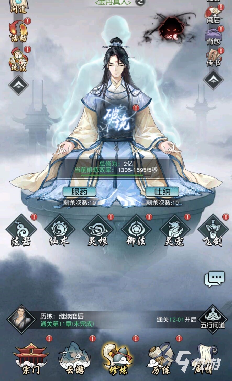 玩家可以通過主界面的修煉板塊進入法器界面,法器界面就在玩家角色模型的下方第一個,玩家直接點擊法器就可以進入到法器的主界面了哦!