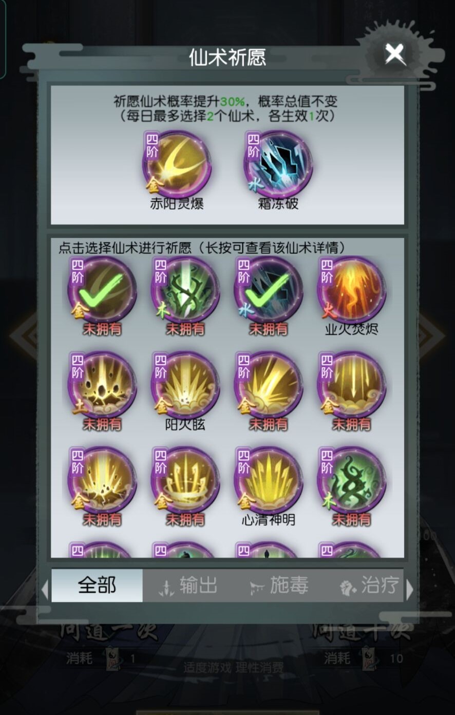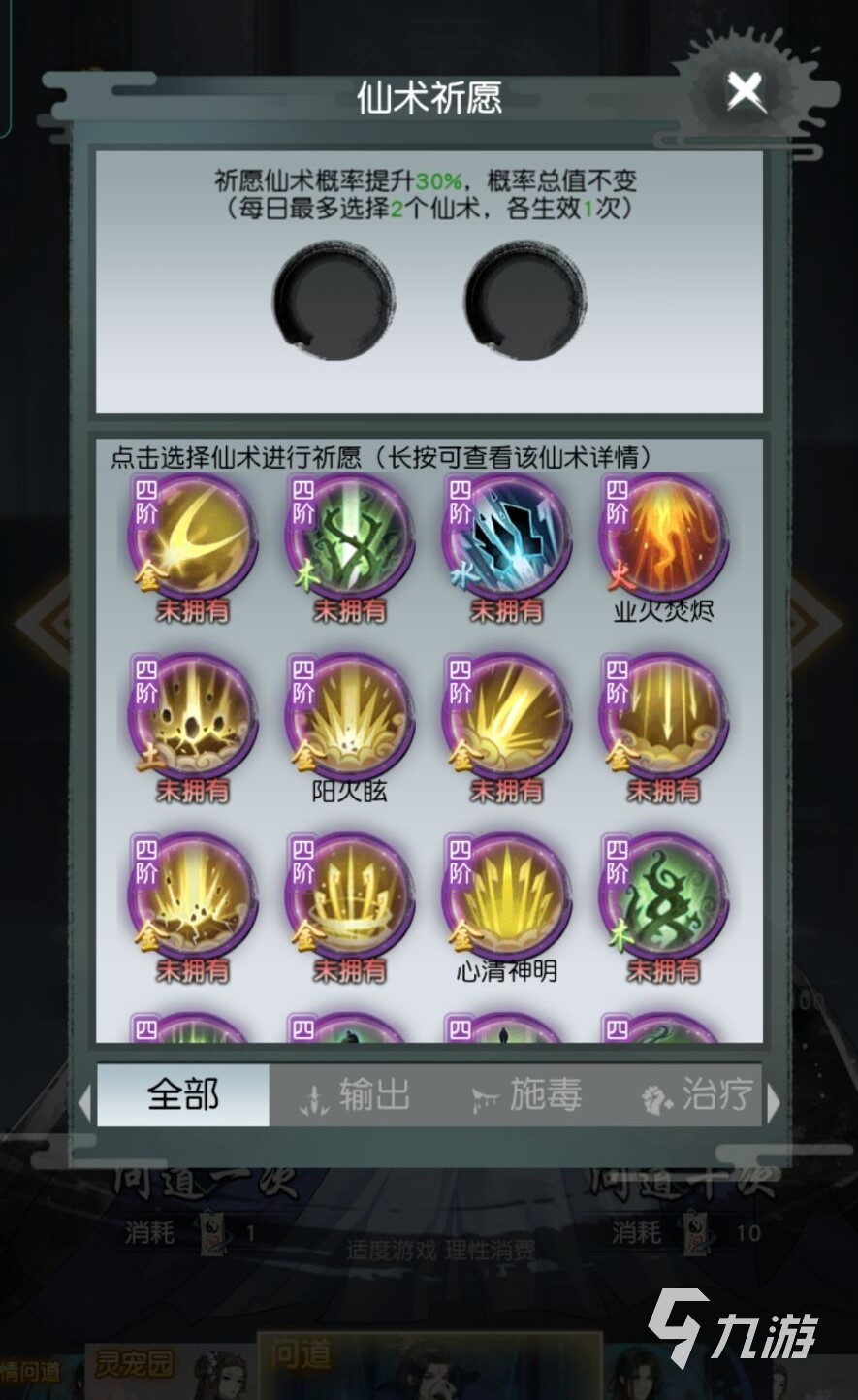 玩家點(diǎn)擊加號(hào)之后就會(huì)進(jìn)入到仙術(shù)祈愿界面了,玩家可以點(diǎn)擊下面的任意一個(gè)仙術(shù)就可以將它們添加到心愿單中了,另外,在心愿單中的仙術(shù)會(huì)獲得額外的百分之三十的抽中概率哦!