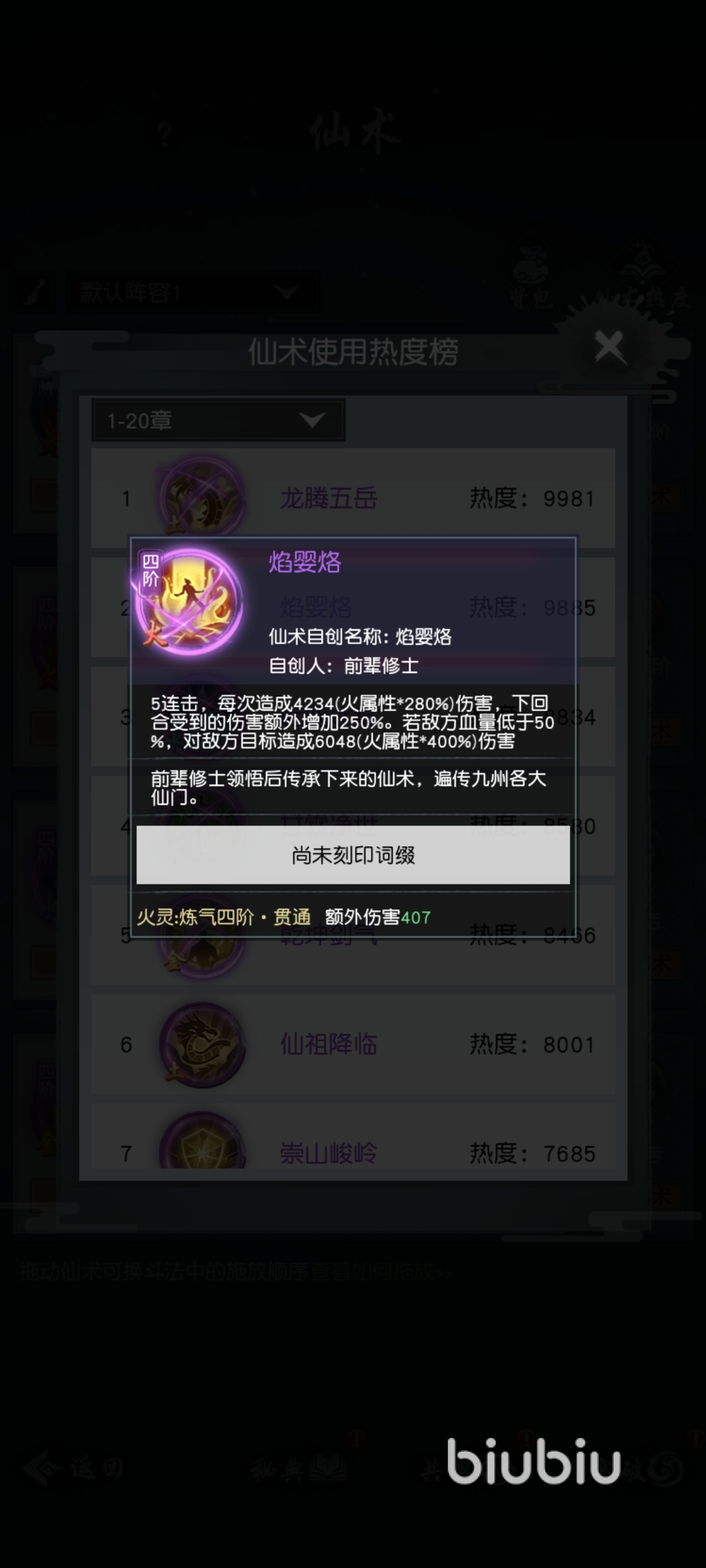 焰嬰烙是我們《以仙之名》游戲中一個非常強(qiáng)勢的仙術(shù)技能,是由前輩修士創(chuàng)立的一門仙術(shù),玩家們在裝備這個仙術(shù)之后,在對戰(zhàn)中可以進(jìn)行5連擊,每次連擊可以造成我們的火屬性*280%的屬性傷害,并且下回合受到的傷害額外增加250%。如果在打擊途中敵人的血量已經(jīng)低于了50%,那么就可以對敵人再次遭橫火屬性*400%的傷害。