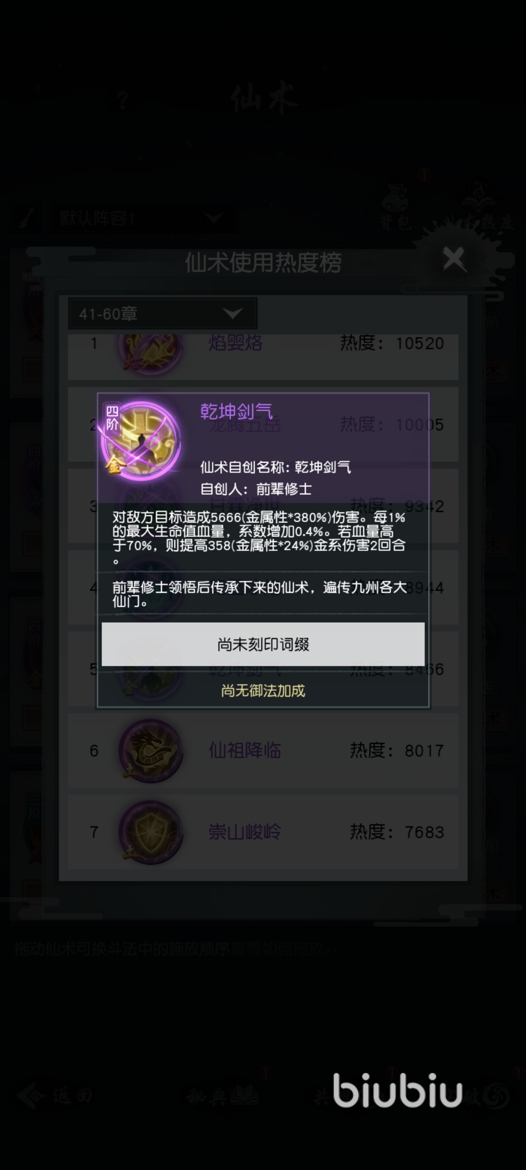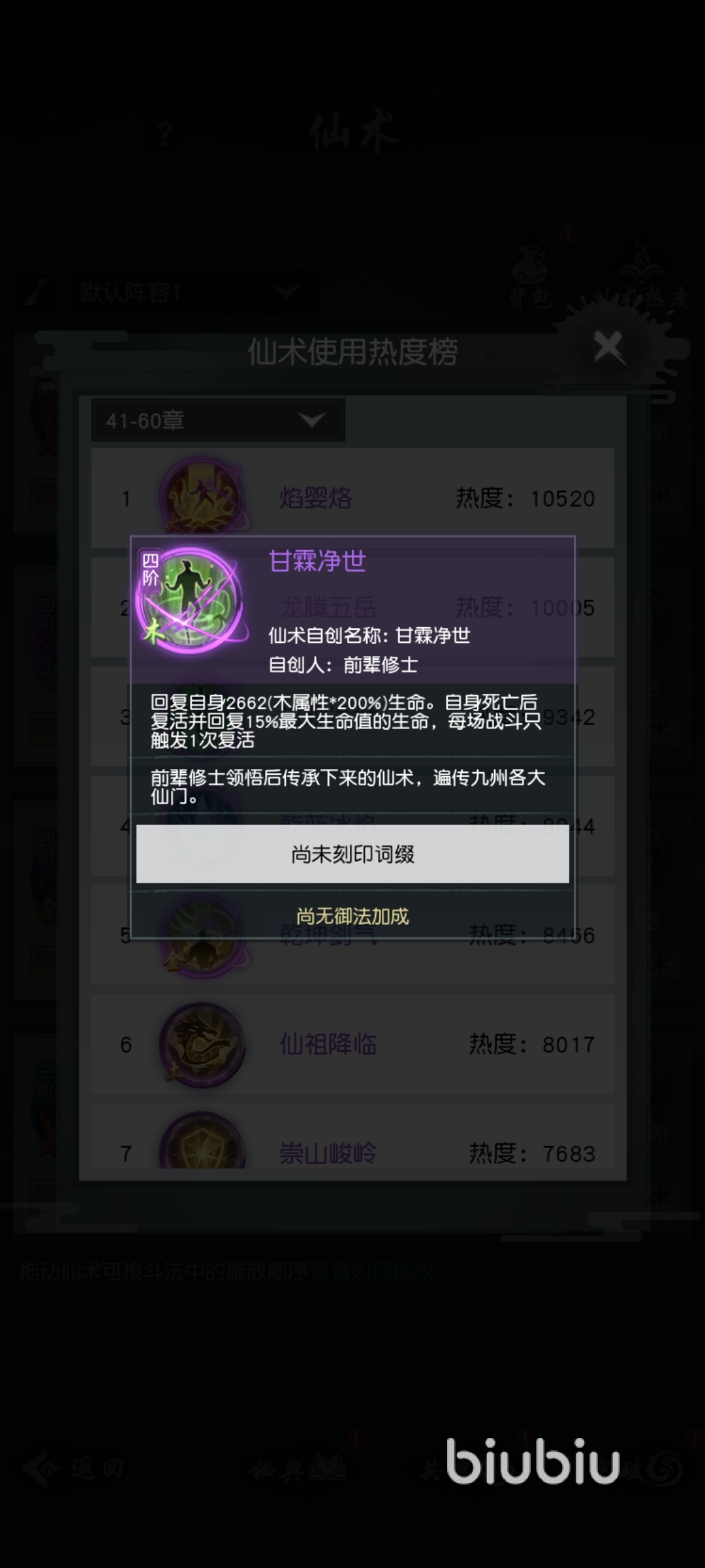 首先,我們確定那些是好的仙術,在這款游戲仙術品質分為:綠色、藍色、紫色和三個品質,其中綠色和藍色都是材料,只有前期玩家們剛進入游戲的時候可以用一下,后期都是靠紫色仙術來作戰(zhàn)的,因此我們直接排除綠色和藍色的仙術。