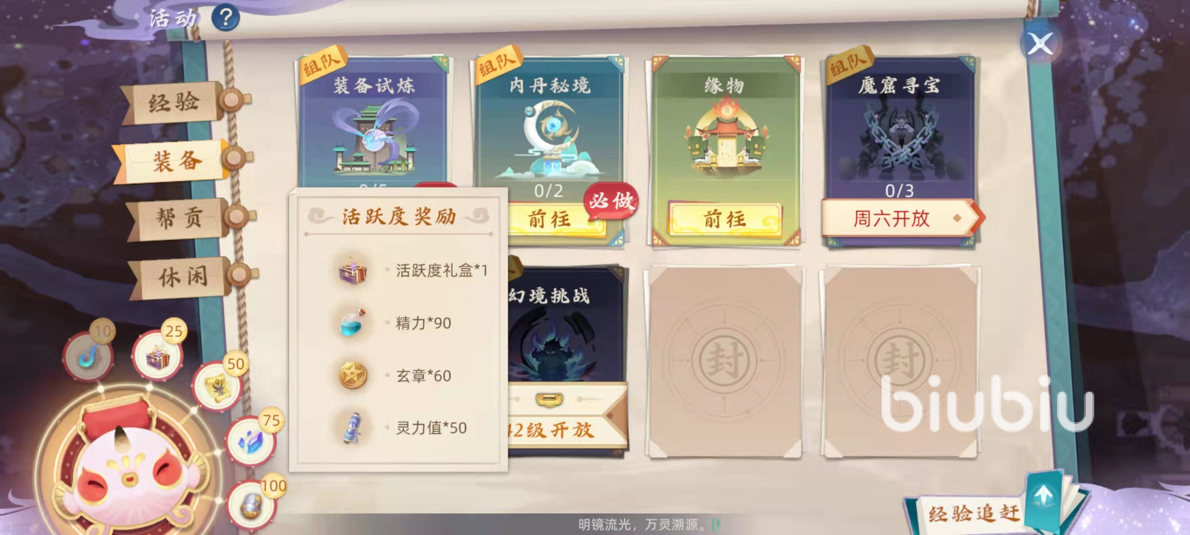 打開界面上方的活動選項,在活動界面的。左下角可以看到當前活躍度任務的完成情況,當每天達到10點活躍度的時候,可以獎勵九十點精力,當達到25點活躍度的時候可以獎勵九十點精力,并且額外獎勵一個活躍度禮盒。之后每獲得25點活躍度,就能夠獎勵90點精力,這樣算下來,如果每天的活躍度可以達到100點,那么總共能獲得450點精力