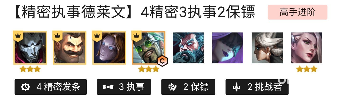 這套陣容主要組成的是四個精密發(fā)條的羈絆,可以為所有隊友增加攻擊速度,而這套陣容的主c德萊文本身就有著非常不錯的破甲能力,有著精密發(fā)條這個羈絆的加持,能夠讓德萊文瘋狂的清場。