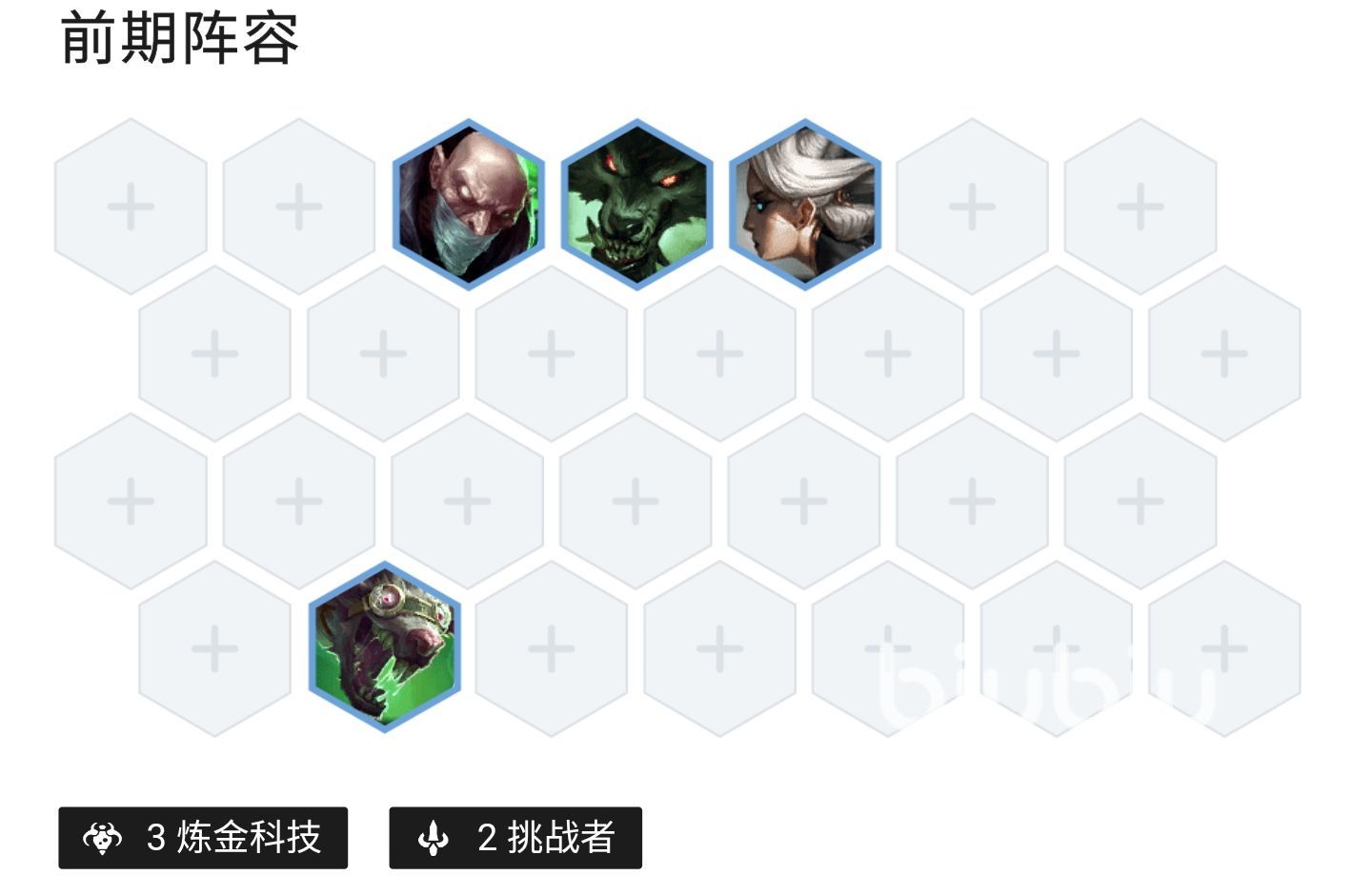 前期可以使用狼人+青鋼影+辛吉德+圖奇過度,這樣不僅可以很好的針對發(fā)明家老鼠,自己在前期的發(fā)育也能得到保障,在中期的時候補蠻王、瑟莊妮,這樣就能湊齊五個煉金科技以及兩個挑戰(zhàn)者和兩個格斗家的羈絆。