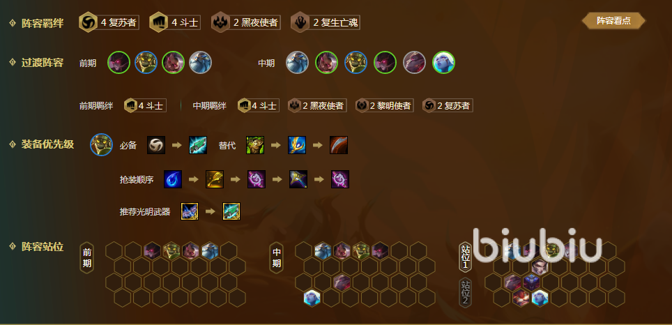 整體的運(yùn)營思路就是前期利用強(qiáng)勢一些的卡牌去打工,中間盡量穩(wěn)定血量,后期在進(jìn)行高費(fèi)卡牌的轉(zhuǎn)型。以上就是小編帶給大家的云頂之弈6斗士復(fù)蘇不死努努攻略。