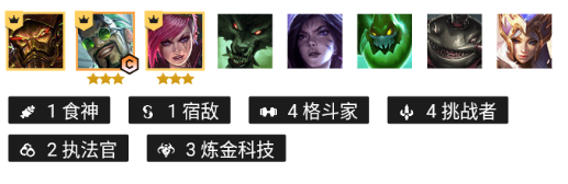 陣容羈絆:一食神一宿敵四格斗家四挑戰(zhàn)者兩執(zhí)法官三煉金科技。