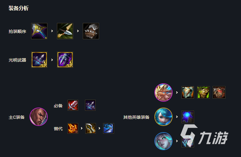 盧錫安必備飲血,剩余輸出裝,輕語=殺人劍>無盡,巨殺肉裝給加里奧或芮爾,誰先2給誰副c可以選擇小炮格溫來的早,法系裝備可以給格溫對(duì)于光明裝備,盧錫安缺啥裝備拿啥,其次拿輔助裝,如基克的先驅(qū),伏擊等。