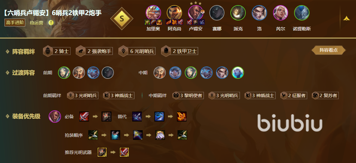 第二套陣容主C為阿克尚和盧錫安,配合加里奧,塞納,派克,洛組成六哨兵,能夠給陣容提供護盾,以及攻速加成。泰坦,芮爾,加里奧組成騎士和鐵甲衛(wèi)士,提高陣容前排的坦度。