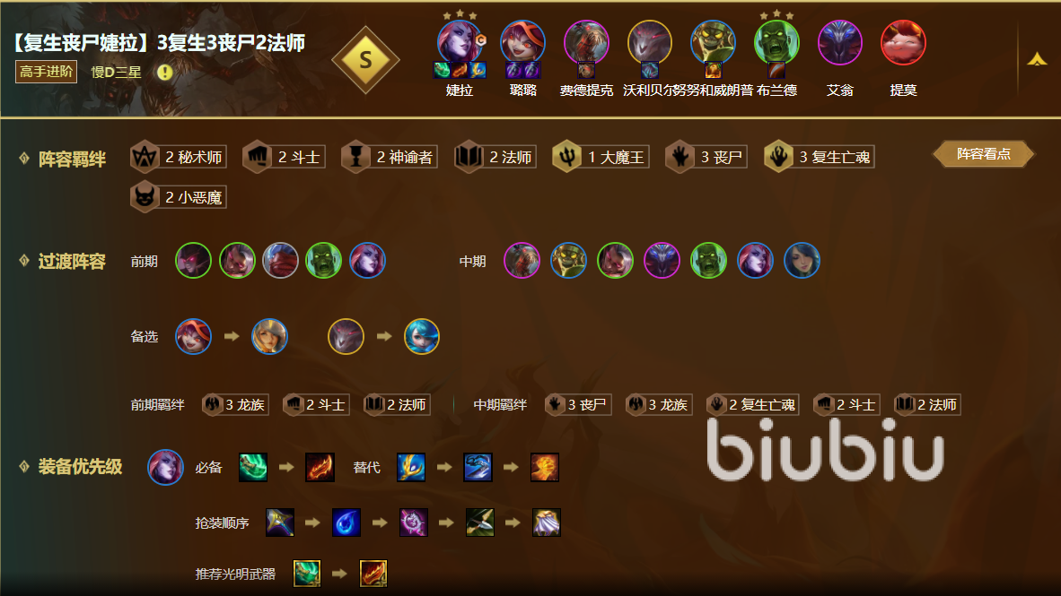 首先看這套最新的復生神諭游俠,這套陣容之前是沒有的,在最近的云頂之弈的比賽中才被玩家開發(fā)出來,發(fā)現(xiàn)這套陣容的強度非常高,這里主C是阿克尚和厄斐琉斯這兩個游俠,游俠的被動攻速就足夠了,所以裝備方面我們只給給攻擊力裝備就好了。然后狗熊,翠神,稻草人湊三復生,提高陣容容錯率,搭配提莫組成神諭者,能夠更快釋放技能。