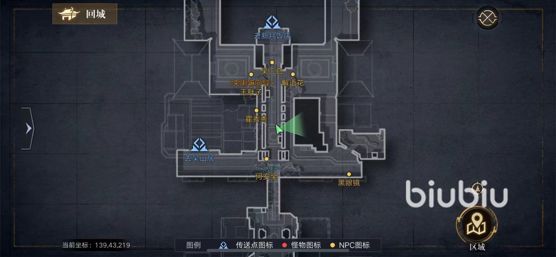 例如第一個(gè)相冊(cè)的線(xiàn)索是【十一倉(cāng)】存放著九門(mén)幾代人的物品,昊天妹妹嚴(yán)守在這里。由此我們可以知道,我們需要尋找十一倉(cāng)。我們打開(kāi)地圖,點(diǎn)回城,進(jìn)入杭州城。我們能看到這個(gè)位置綠色的地方,就是十一倉(cāng)??拷粋}(cāng)牌匾門(mén)口,你的頭頂會(huì)出現(xiàn)一個(gè)相機(jī),你點(diǎn)進(jìn)去就可以進(jìn)行拍照了。