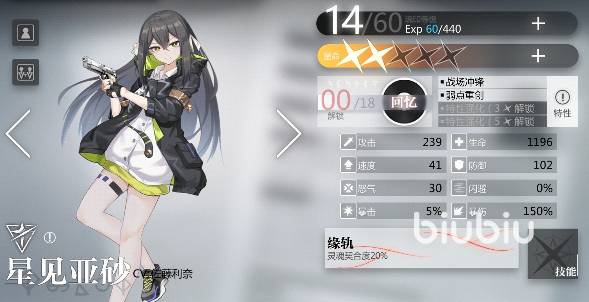 星見亞砂屬于單體爆發(fā)中的天花板,其大招[消逝的未來]可以造成百分之三百的暴擊傷害,并無視敵方防御,同時回復(fù)怒氣值,是流血編隊(duì)的后排殺手,超級強(qiáng)悍的爆發(fā)型輸出人偶,很值得玩家培養(yǎng)。