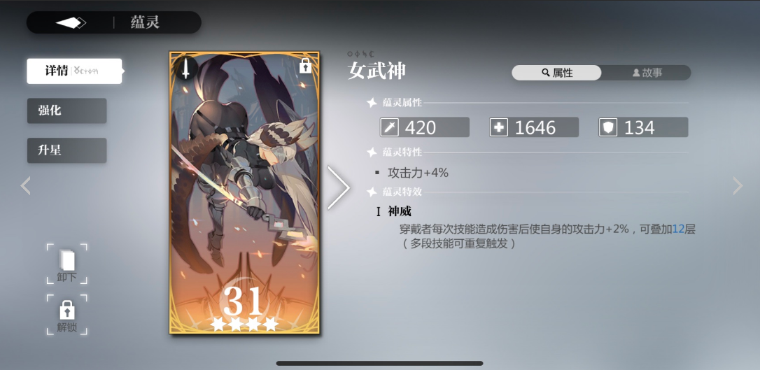 女武神可以提升裝備角色的部分攻擊力,并且每次技能傷害后可以進一步提升攻擊力,最高疊加15層提升效果,是一個非常優(yōu)秀的增傷蘊靈,也跟莉莉艾洛的技能十分契合,適合莉莉艾洛這些擁有多段傷害的輸出角色裝備。