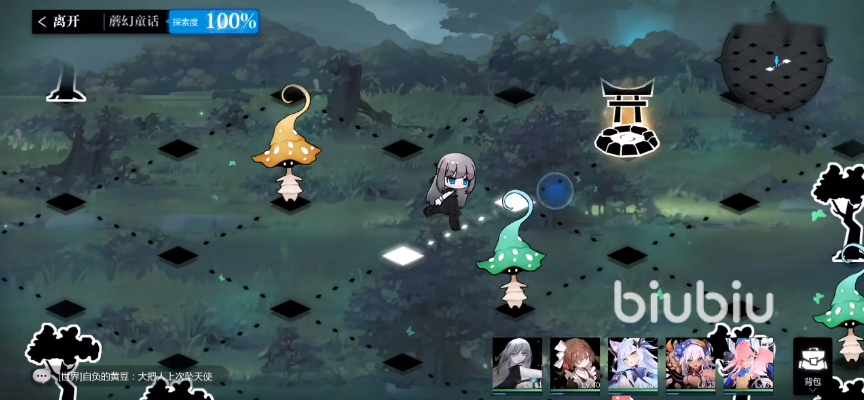進入到本章地圖后我們可以看到上圖所示的三個蘑菇,開局優(yōu)先朝地圖上方探索,也就是黃色蘑菇的方向。地圖下方的部分解密要素需要用到地圖上方探索所獲得的道具,因此先往上走可以避免白跑路。一直往上方走到森林區(qū)域,在森林最中間的樹干上存在著一個傳送點,這個傳送點是比較容易遺漏的。通過該傳送點可以到達(dá)一片隱藏區(qū)域,在這里討伐怪物能夠拿到金蘋果道具。