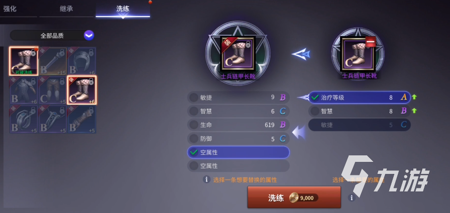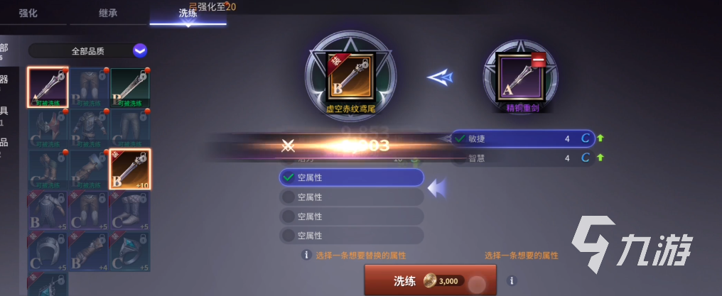 最后就是洗練屬性,洗練的話建議是紫色品級(jí)以上的裝備來(lái)進(jìn)行操作。洗練屬性是以C、B、A和S這樣來(lái)體現(xiàn)的, S是目前最好的一個(gè)品級(jí)。但是屬性的變化也是比較多的,目前建議的選擇是力量智慧之類的核心屬性。想要更好的生存,也可以選擇敏捷、防御和生命這幾個(gè)屬性來(lái)做好提升。