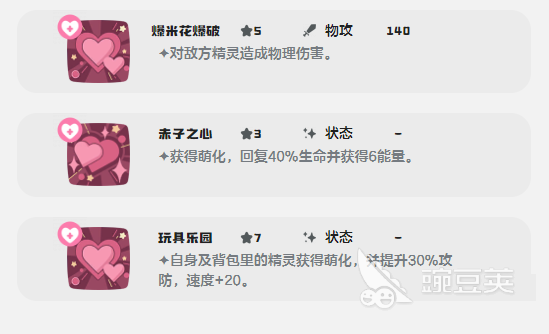 主動(dòng)輸出的物理攻擊【超級糖果】,威力值為130,可將目標(biāo)進(jìn)入到“萌化”狀態(tài),打亂敵人的判斷力,并且還能提升部分技能的傷害;