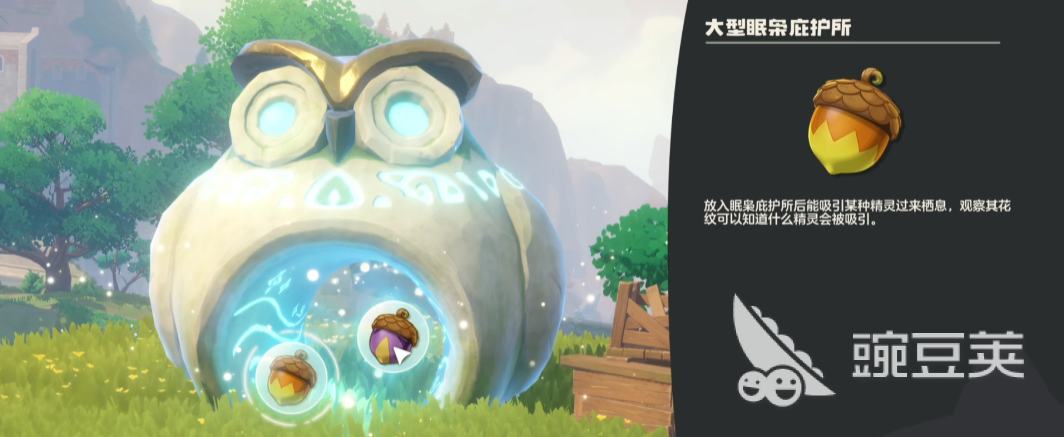 捕捉它需要使用到精靈果實(shí),要將果實(shí)放置在眠梟庇護(hù)所里面,它才會(huì)生成精靈;而眠梟庇護(hù)所需要依靠大世界探索中的眠梟之星來(lái)解鎖,圖中風(fēng)車(chē)的頭上就有一個(gè),大家平時(shí)在跑圖的時(shí)候,要多多注意觀察,多收集一點(diǎn)眠梟之星。