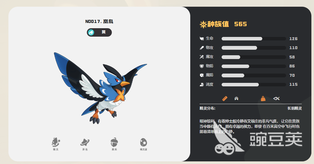 該精靈的獲取非常的簡單,只要玩家在野外捕獲就行了,野外有非常多的形態(tài),而且顏色也是千奇百怪,需要進化的話只要大家將它的等級提升到30級的實力,就會自然進化為嵐鳥,擁有565左右的實力,可以作為一般的寵物對戰(zhàn)使用,還能作為飛行寵物使用。
