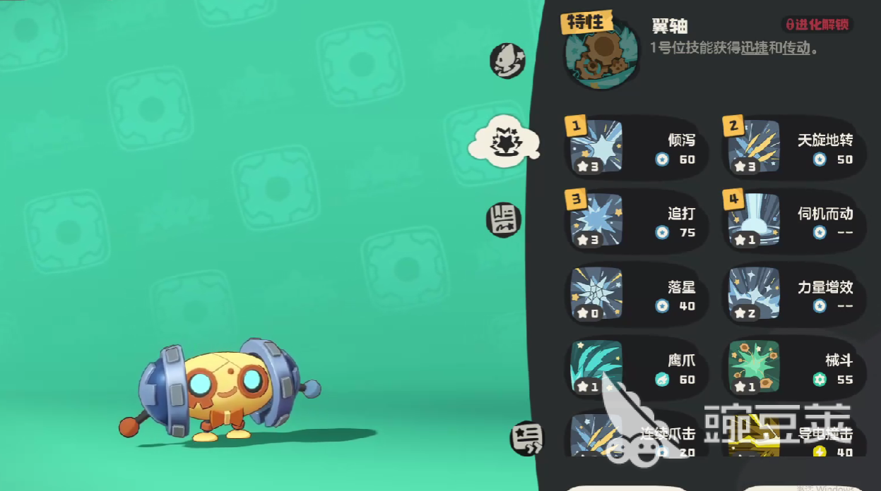 螺旋帕帕在進(jìn)階之后,還能夠獲取特性“翼軸”,使得戰(zhàn)斗之中一號(hào)位的技能,直接獲取“迅捷”和“傳動(dòng)”效果,核心技能可以攜帶傾瀉、天旋地轉(zhuǎn)、追打、伺機(jī)而動(dòng)、落星、力量增效、鷹爪、械斗、連續(xù)爪擊、導(dǎo)電撞擊。