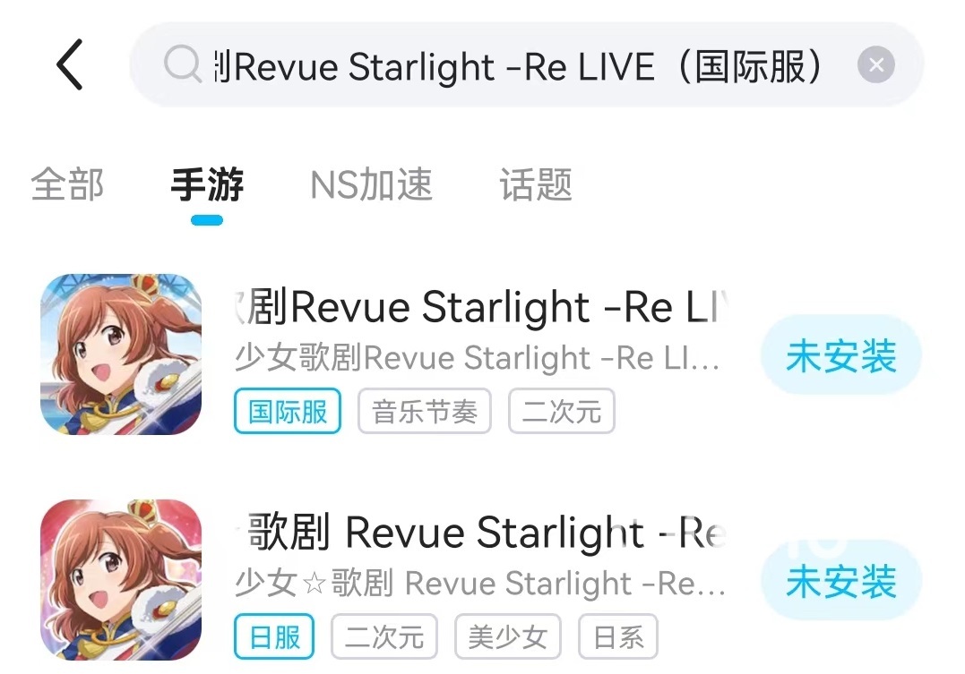 第2步開始加速之前,將少女歌劇RevueStarlight ReLIVE國際服客戶端先安裝到手機(jī)中,如果已經(jīng)安裝可以直接在加速器中搜索名稱進(jìn)行加速。