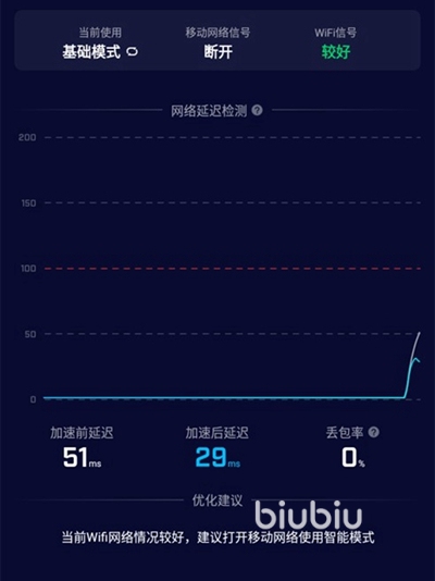 biubiu加速器支持基礎(chǔ)和智能這兩種加速模式,如果大家僅僅開啟WiFi進行游戲的話,那么默認開啟的是基礎(chǔ)模式,加速器將使用WiFi網(wǎng)絡(luò)進行游戲的連接和加速。如果大家同時開啟4G或者是5G網(wǎng)絡(luò)的話,推薦使用智能模式,可以幫助我們提升游戲網(wǎng)絡(luò)環(huán)境的穩(wěn)定性。